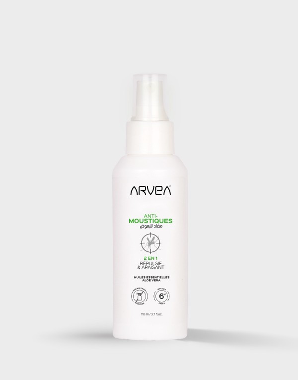 L’anti-moustiques d’ARVEA est un produit à appliquer sur la peau. 2 en 1 répulsif et apaisant en même temps, ce spray est doté d'une efficacité jusqu’à 6H grâce à ses actifs naturels à base d’un cocktail de (05) cinq huiles essentielles : huile essentielle de citronnelle, de géranium, d’eucalyptus, de basilic et d'écorce de pamplemousse. Riche en Aloe vera, il apaise aussi les démangeaisons et les piqûres et apporte un effet hydratant.